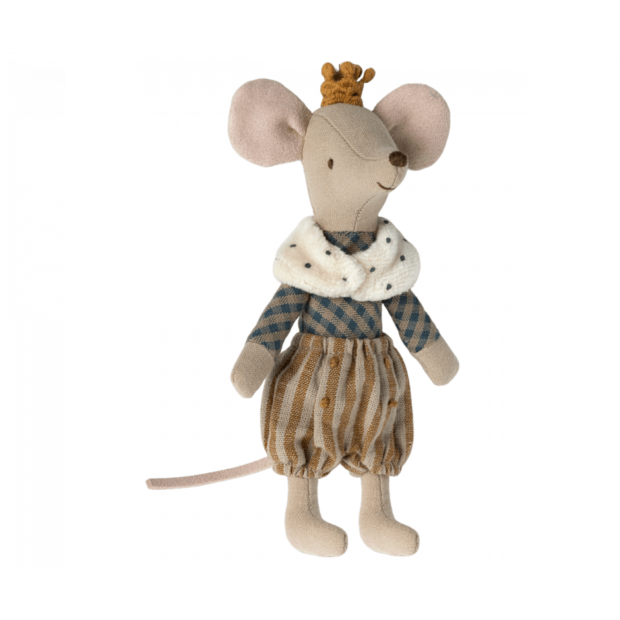 A real mouse prince in big brother size. He's dressed in his finest clothes with magnificent details and a golden crown. He fits perfectly into Maileg Castle.