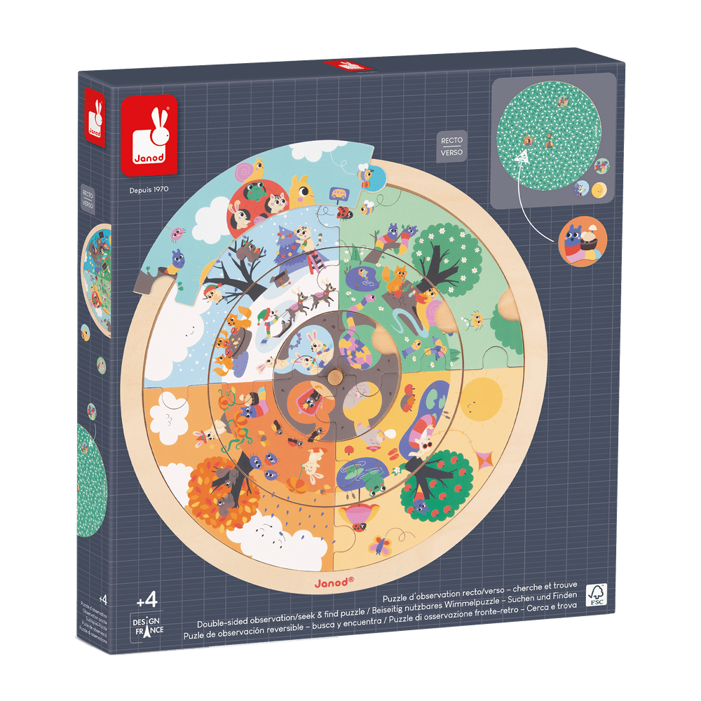 On the back of this educational puzzle, the seasons are right at your fingertips: your child can assemble and manipulate the pieces to recreate the four seasons. It's a wonderful way to make the concept of time, which can be rather abstract for toddlers, very concrete through hands-on manipulation! On each face of this wooden puzzle, your child will discover charming nature scenes and little animals. And how fun it is to turn the pieces!