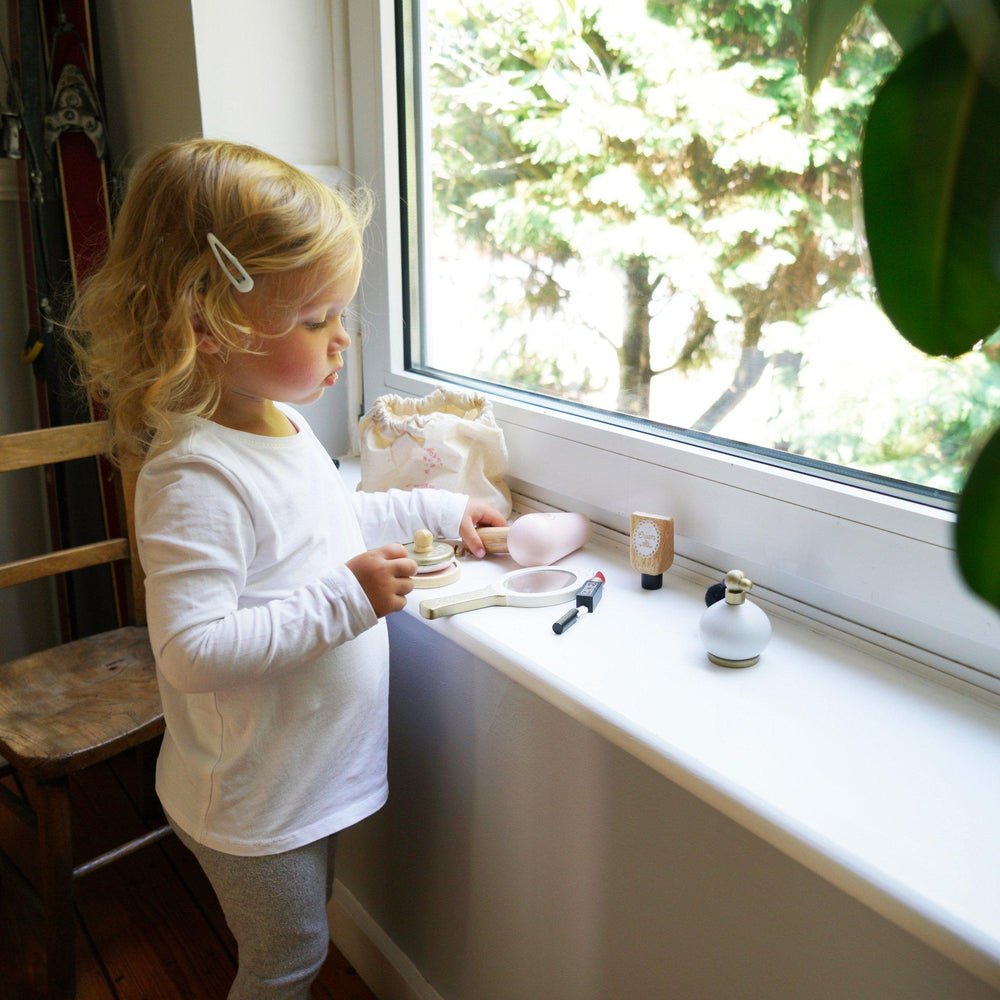 Inside the cosmetic bag you will find an assortment of wooden accessories, including a vintage perfume bottle with a bulb atomizer, a hand mirror, a hair dryer, a comb, a compact makeup kit , lotion, nail polish, lipstick and powder puff. Made of durable rubberwood, gold paint finish and high quality natural cotton.