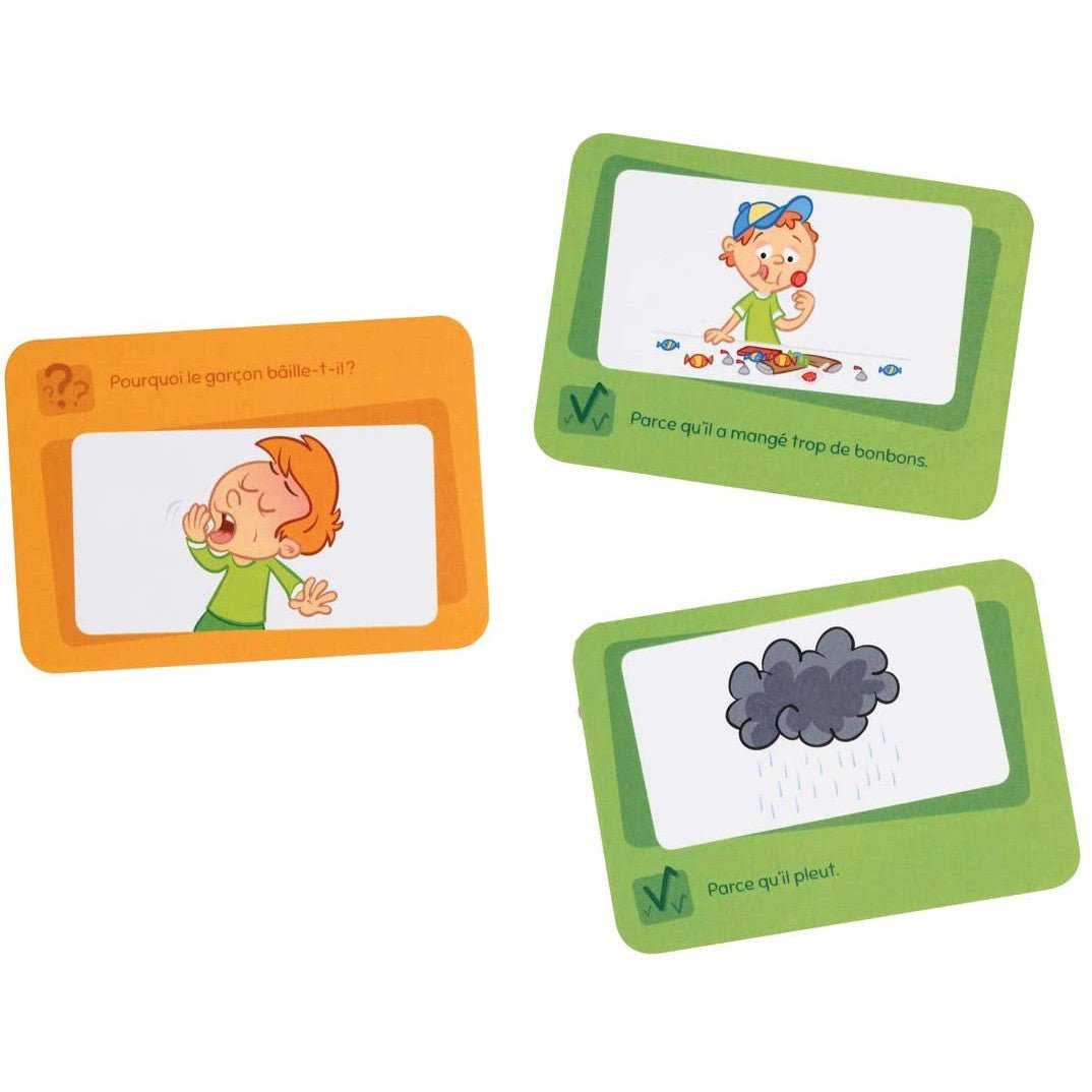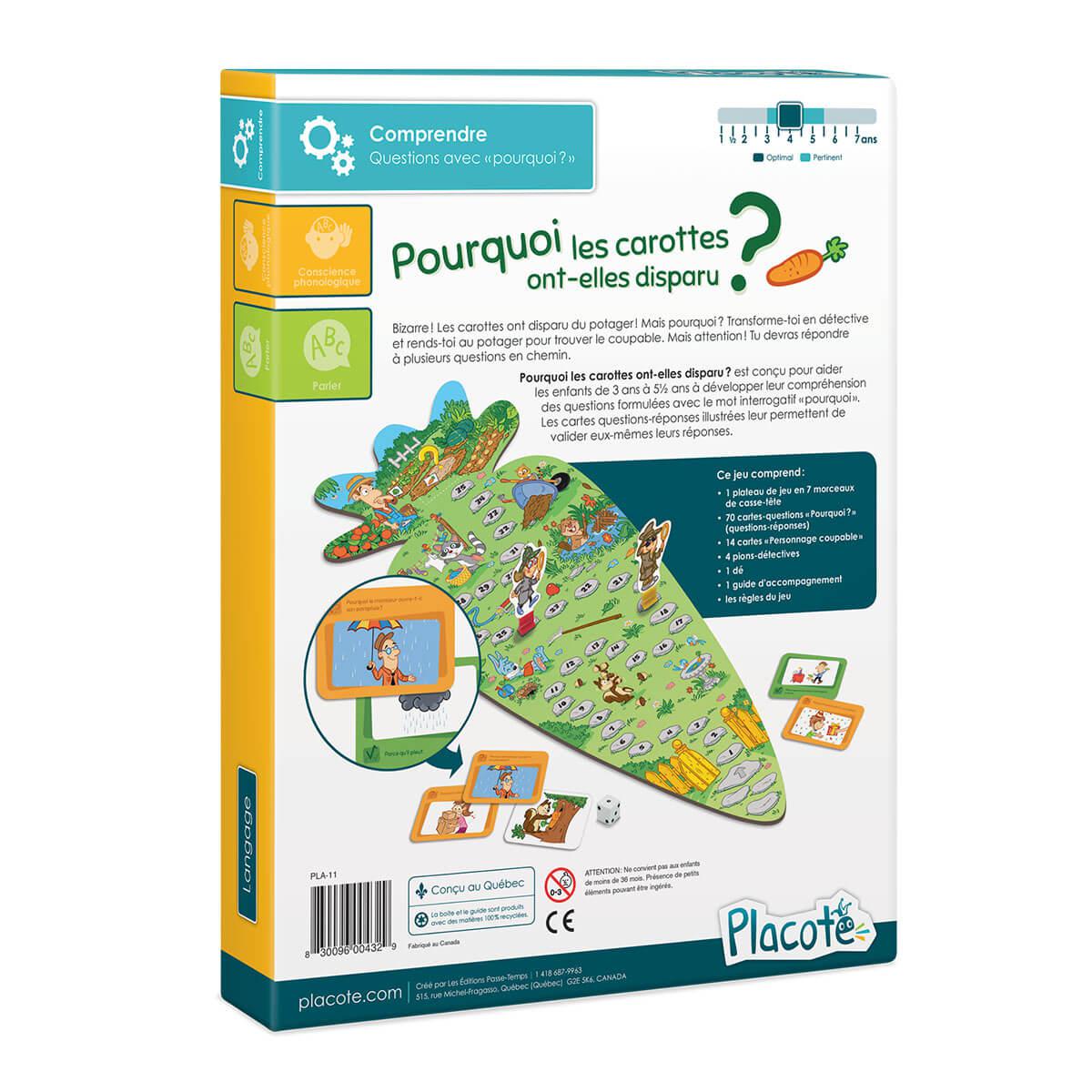 Why did the carrots disappear? is designed to help children ages 3 to 5½ develop their understanding of questions phrased with the interrogative word “why”. The illustrated question-answer cards allow them to validate their answers themselves.