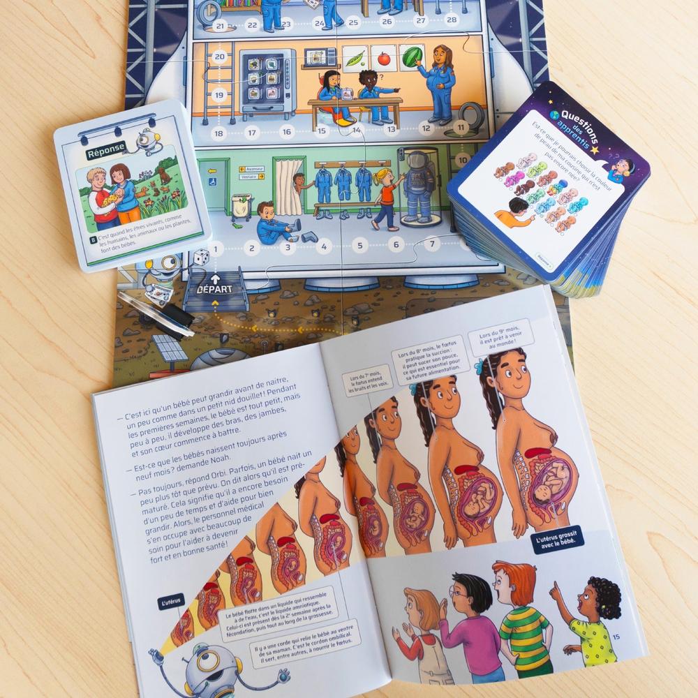 The game includes a game board, 108 question cards and an illustrated book that explains the stages of reproduction to children in a simple and fun way.
