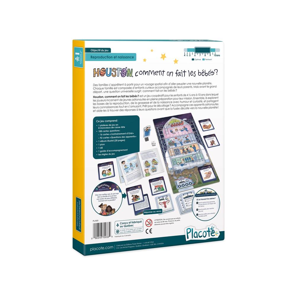 Houston, How Are Babies Made? is a cooperative game for children aged 4½ to 10 in which players take on the roles of young astronauts preparing for their mission. Together, they explore the basics of reproduction, pregnancy, and birth with humor and curiosity, sharing their knowledge while having fun. Ready for liftoff? Join these apprentice astronauts and help them find answers to their questions before the rocket launches to the new planet!