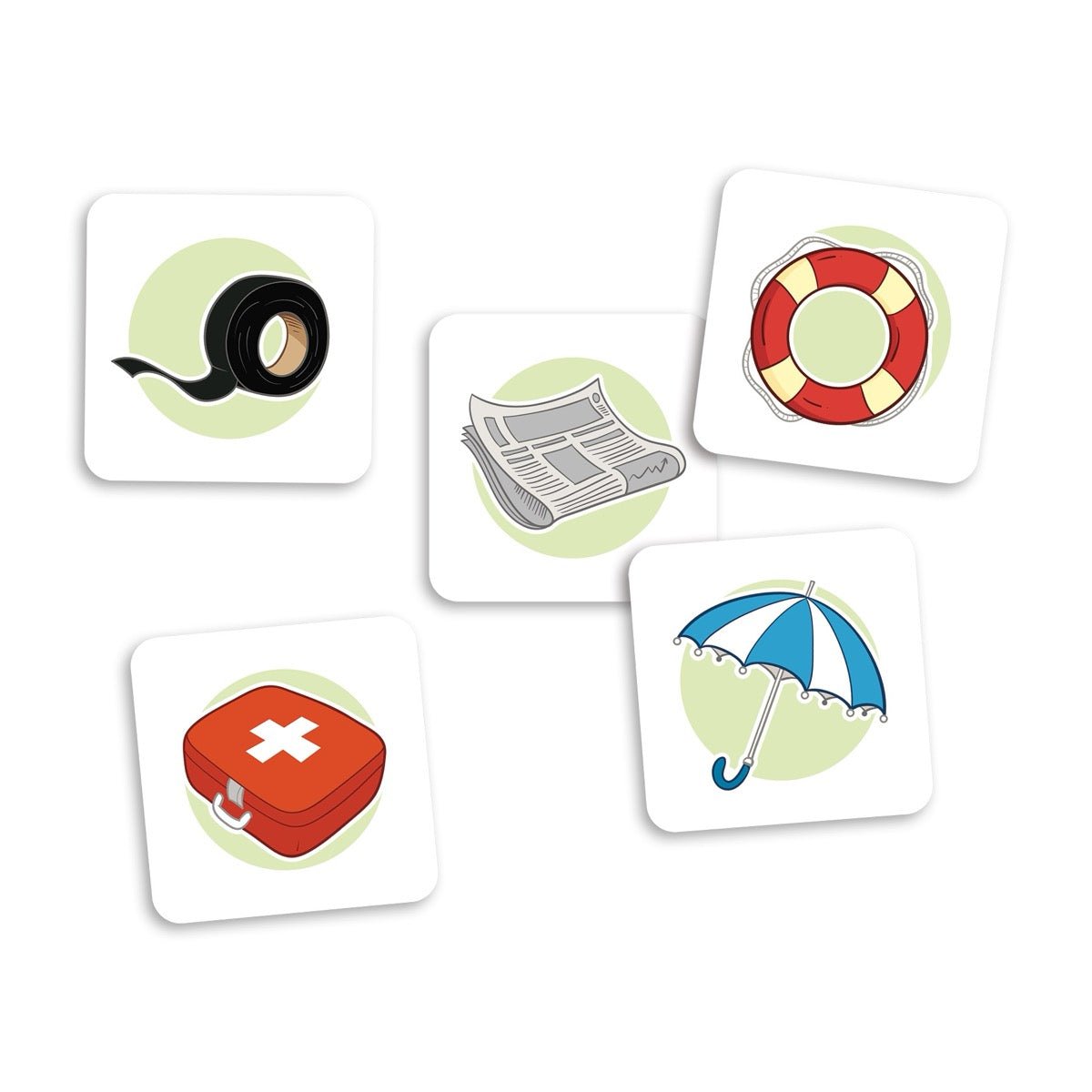 - Players each have a pawn that they move after rolling the die and object cards that they use to solve problems (e.g., water in a bucket can put out a fire).