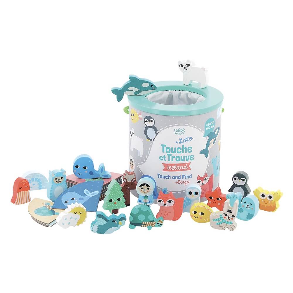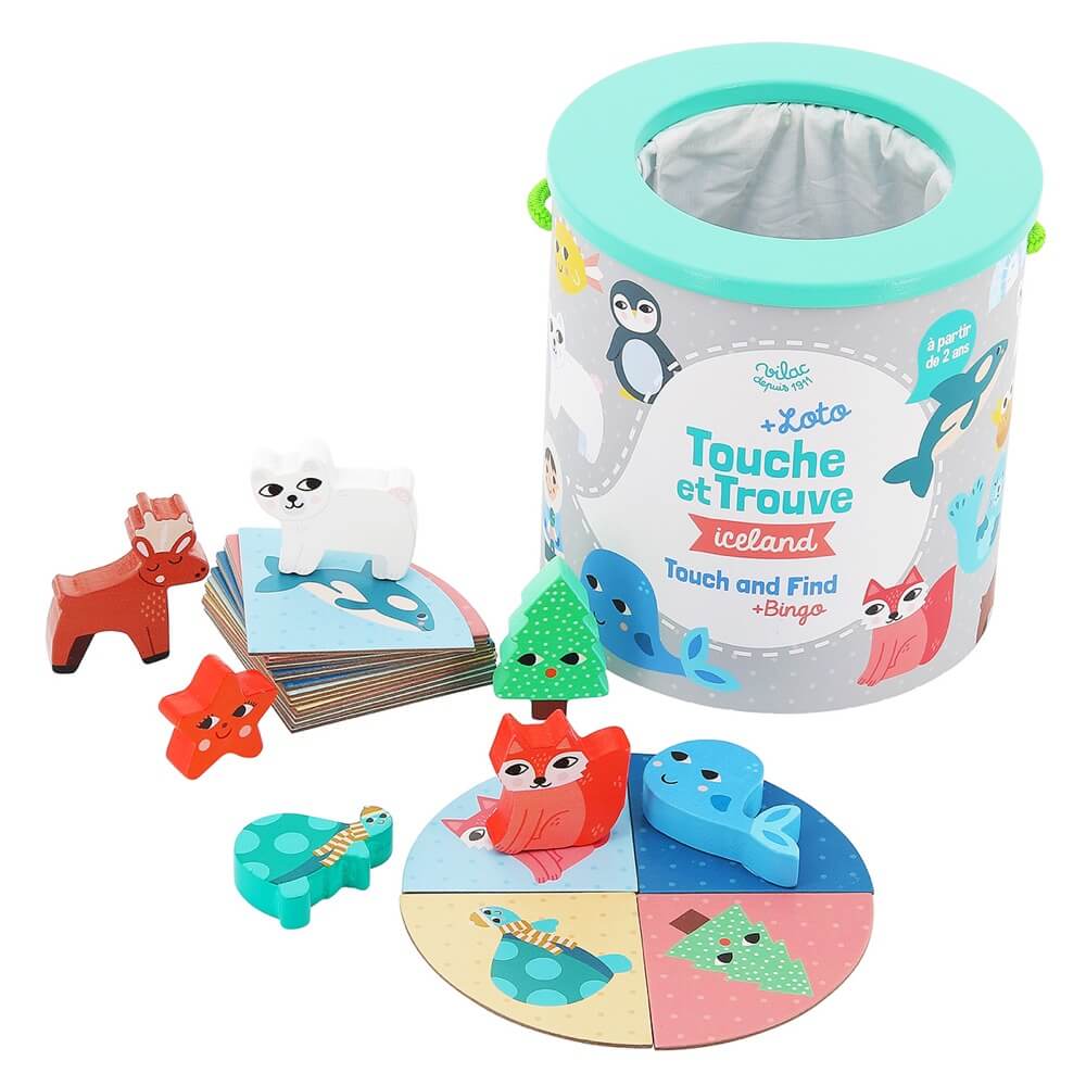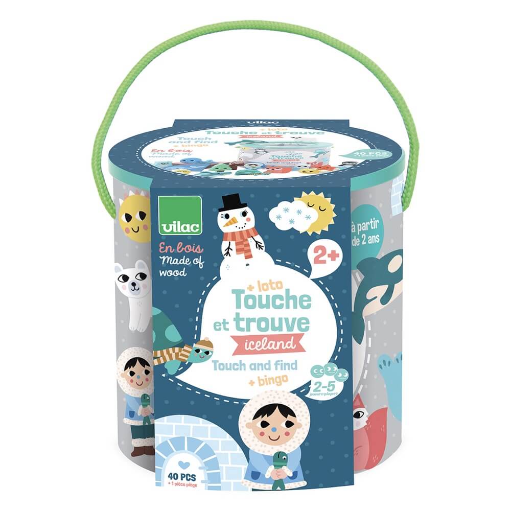 Discover the game Touch and find Cceland by Vilac, illustrated by Michelle Carlslund, an educational game on the sense of touch for children from 2 years old. A tactile recognition game and a bingo on the theme of the ice floe in very soft tones.