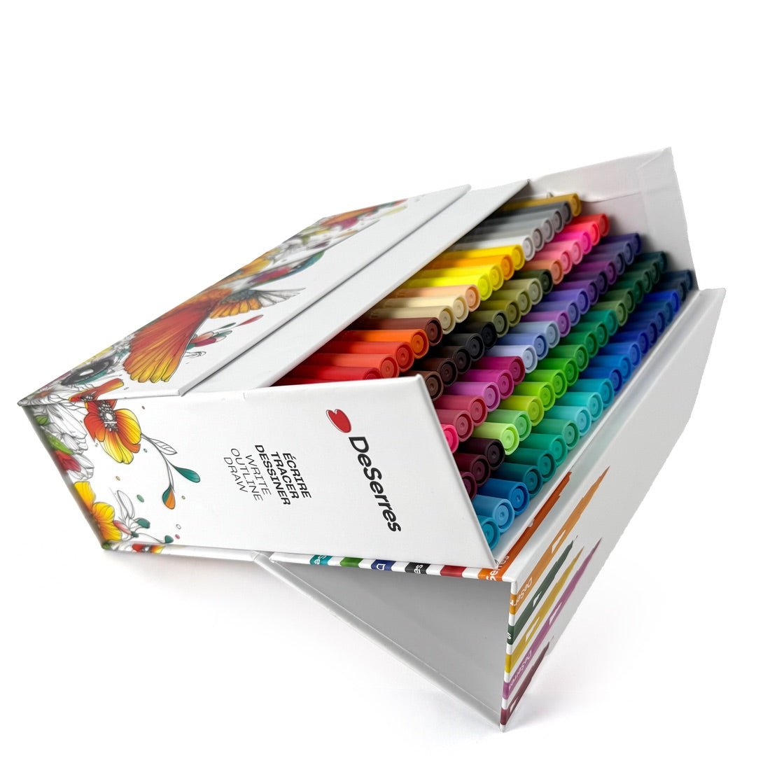 Cet ensemble propose une large palette de 100 marqueurs à double pointe : une pointe pinceau souple pour des tracés fluides et expressifs, et une pointe fine pour les détails précis. Leur encre à base d'eau, transparente et à faible odeur, est idéale pour la superposition et la réalisation d'effets aquarelle lorsqu'elle est utilisée avec de l'eau.