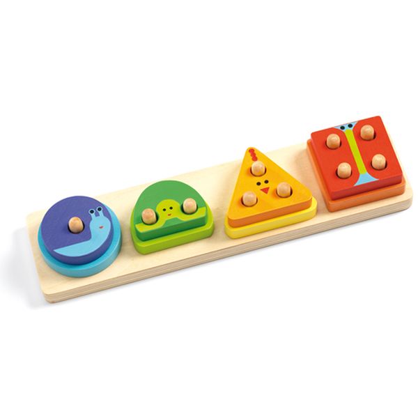 Un tout premier jeu d’encastrement en bois pour sensibiliser les tout-petits aux formes et aux couleurs, dès 12 mois. L’enfant s’amuse à encastrer et empiler sur le plateau. 4 animaux à découvrir : un escargot, une tortue, une poule, une coccinelle.