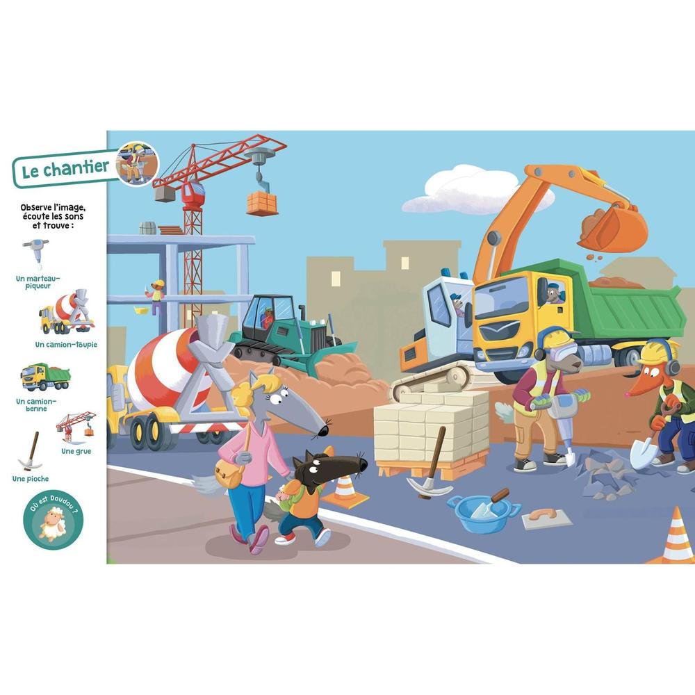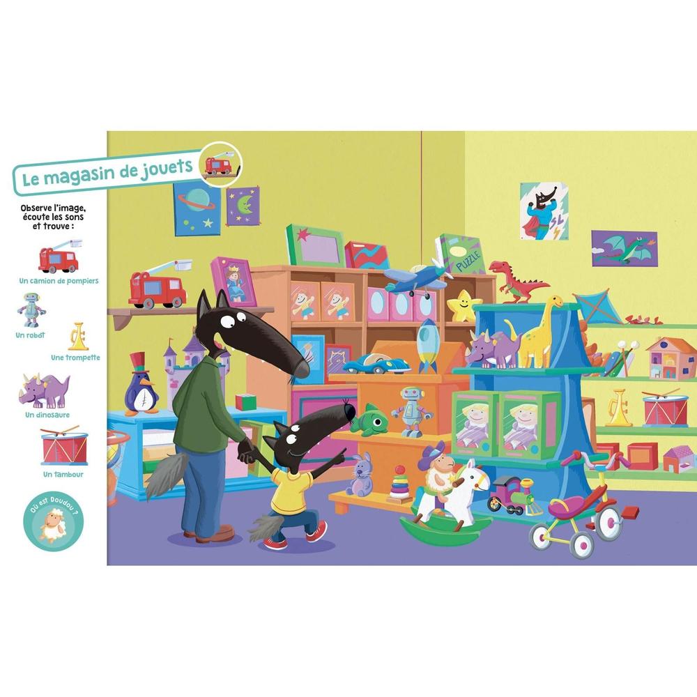 Sur chaque double-page, l’enfant doit trouver 5 éléments. Il les cherche grâce à l’illustration mais aussi grâce au son correspondant à l’élément (cris d’animaux, bruit de transport, d’outils, d’objets du quotidien…) 20 doubles-pages avec des univers du quotidien de P’tit Loup : parc, école, cuisine, ferme… À la fin une page avec des sons à deviner !