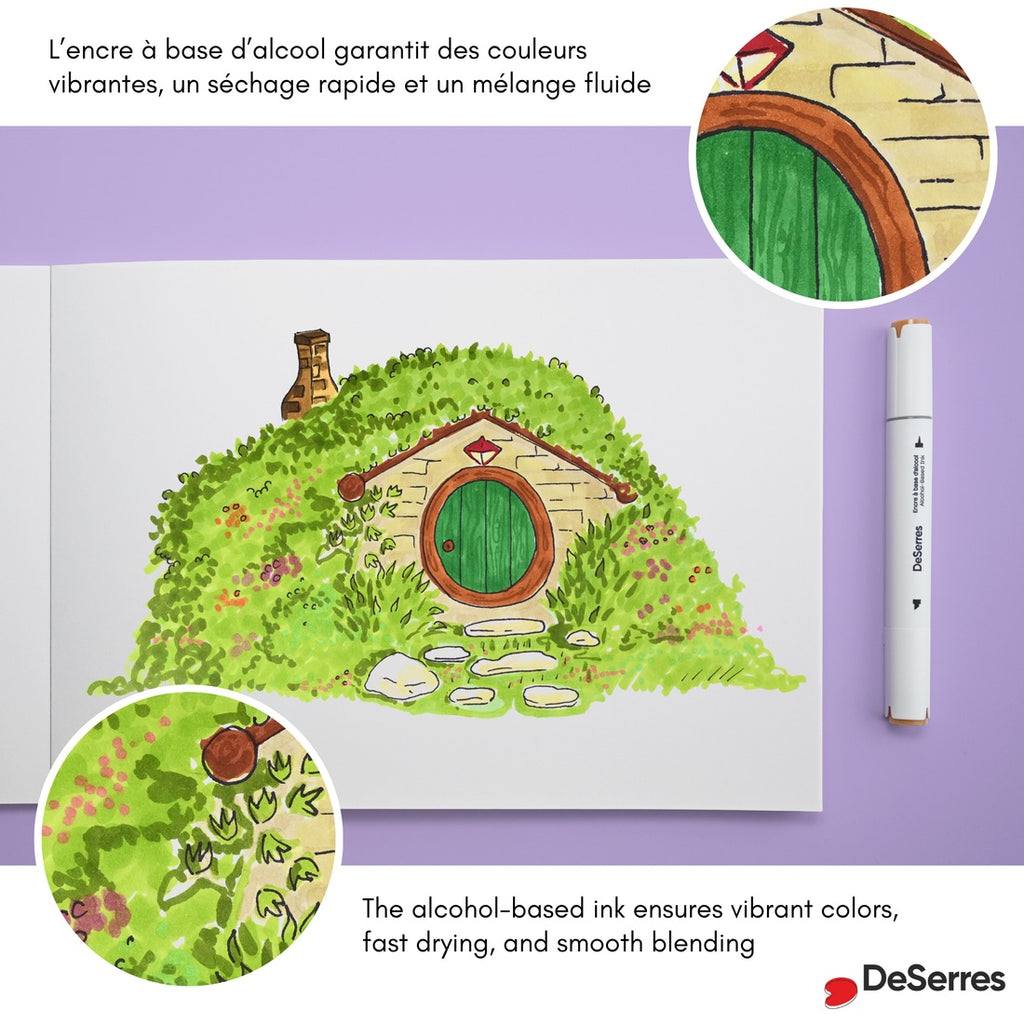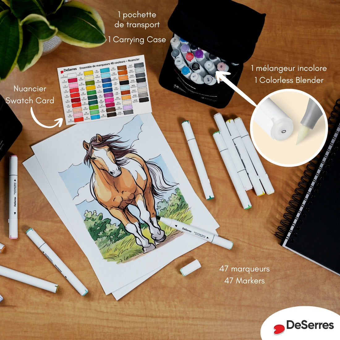 Cet ensemble de 48 marqueurs à double pointe en nylon offre une grande polyvalence : la pointe pinceau permet des tracés expressifs et des dégradés subtils, tandis que la pointe biseautée est parfaite pour les aplats et les contours nets. Leur encre à base d’alcool garantit des couleurs vibrantes, un séchage rapide et un mélange fluide. Inclus : un mélangeur incolore et un étui robuste pour un rangement pratique.