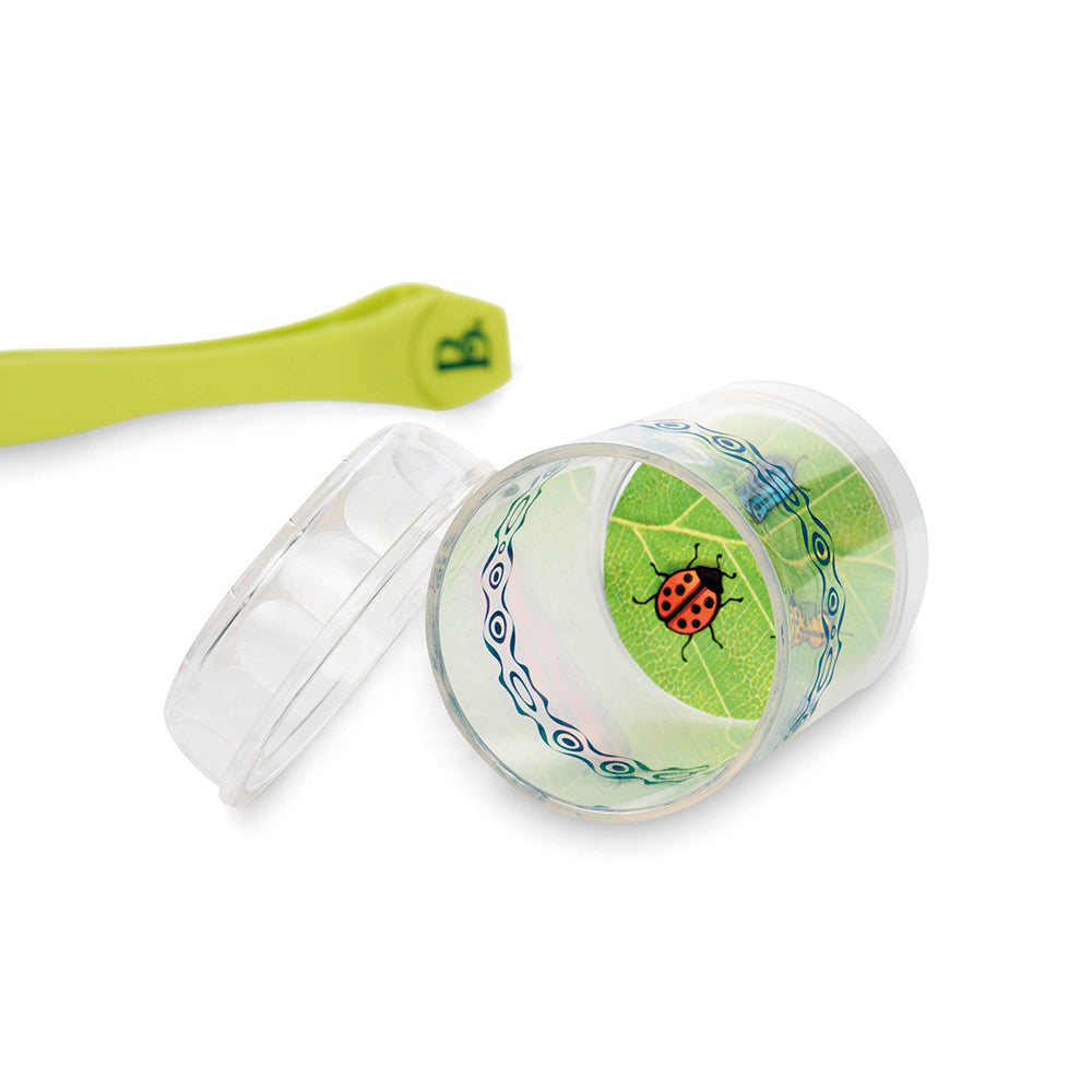 Le filet garde les insectes heureux et en sécurité pendant ton exploration. L'étui de transport t'aidera à rapporter les bestioles que tu as attrapées avec les petites pinces. La loupe pratique te permet de les examiner de près.