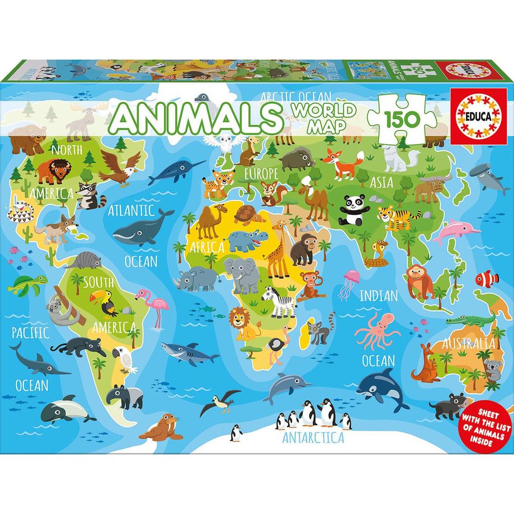 Casse-tête de 150 pièces représentant une carte du monde et des animaux emblématiques.