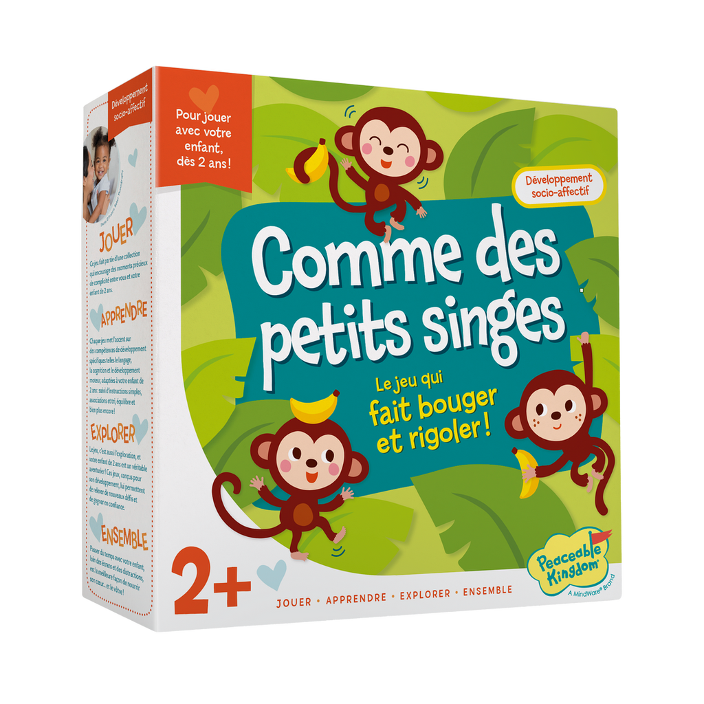 Préparez-vous à bouger ! Comme des petits singes contient 40 cartes qui invitent les joueurs à faire des mouvements ensemble - des accolades aux high five en passant par des compétences simples comme l'équilibre, le saut et la marche.