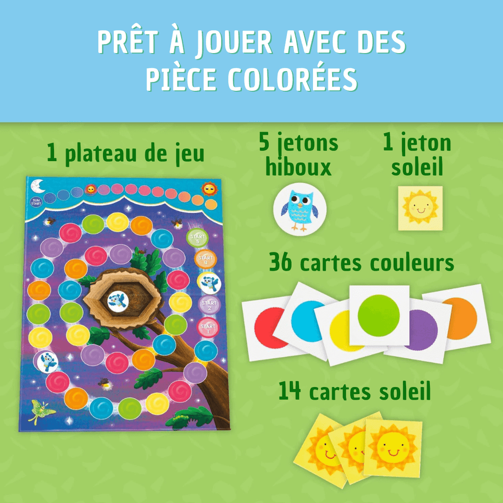 - Contenu: plateau de jeu, 5 hiboux, 1 jeton soleil, 50 cartes Couleur et Soleil.