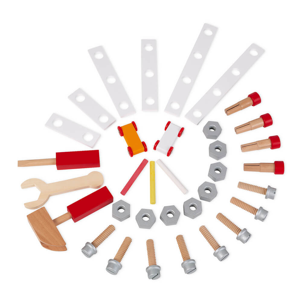 Idéal pour enfants de 3 à 8 ans, ce magnifique établi en bois est aussi beau que complet ! En bois cintré, il est très original et se joue des 2 côtés : Côté recto, on retrouve un établi magnétique complet, avec un système astucieux d'outils magnétiques afin que le matériel soit toujours rangé à la bonne place et de nombreux accessoires pour inventer des objets à monter et à démonter à l'infini. Sont inclus également 3 outils magnétiques, 29 accessoires (écrous, vis, clous en bois, plaquettes, craies …), un étau, un système d’engrenage et une ardoise (sur le côté) pour écrire à la craie.