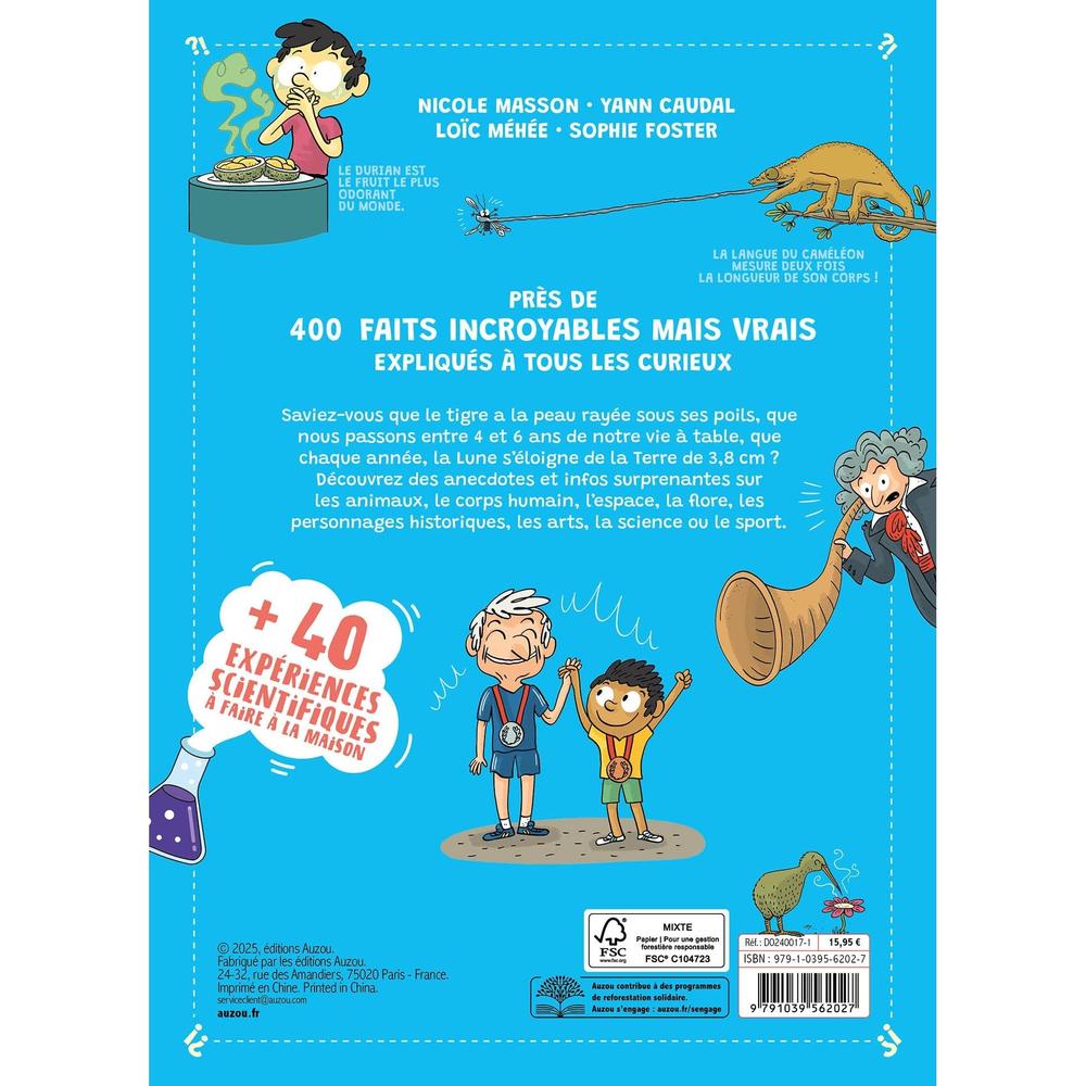 Saviez-vous que le tigre a la peau rayée sous ses poils, que nous passons entre 4 et 6 ans de notre vie à table, que chaque année, la Lune s’éloigne de la Terre de 3,8 cm ? Découvrez des anecdotes et infos surprenantes sur les animaux, le corps humain, l’espace, la flore, les personnages historiques, les arts, la science ou le sport.