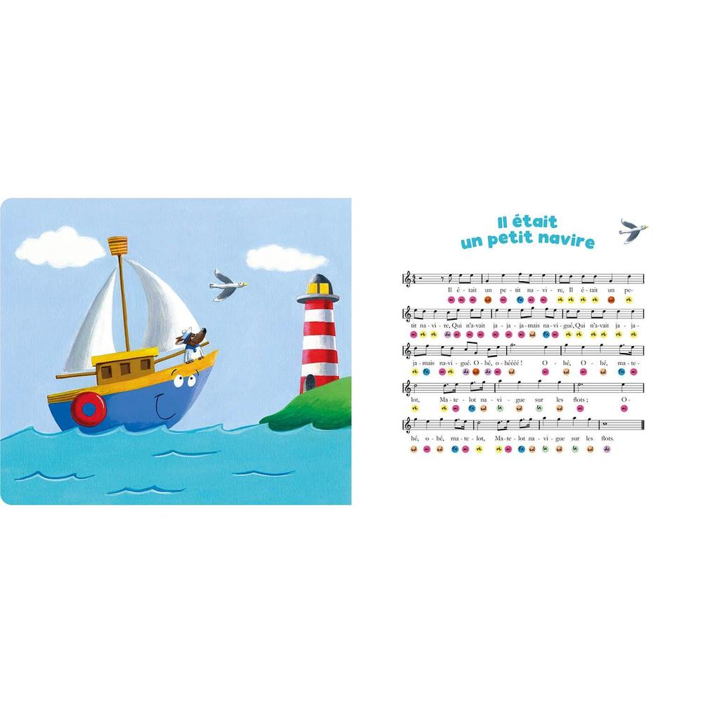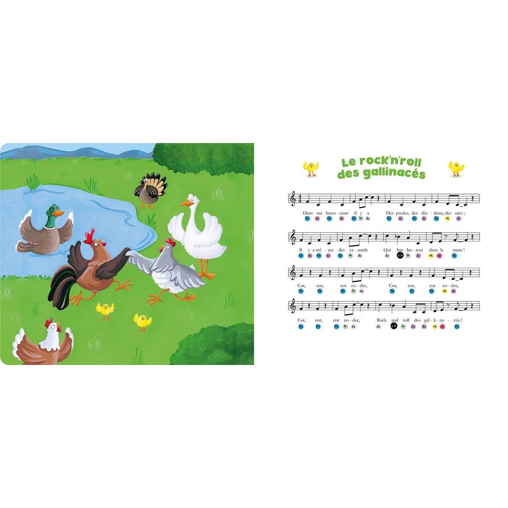Munie d'un piano intégré, la collection propose des comptines adaptées aux tout-petits ! Sur la page de gauche, le texte de la comptine accompagné d'une illustration, sur la page de droite, la portée musicale avec des cercles de couleur pour faciliter le jeu !