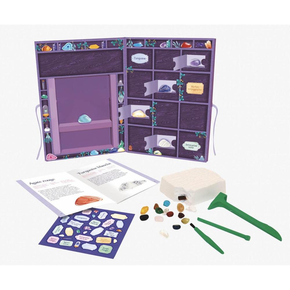 Grâce à tes outils, retrouve tes pierres naturelles dans le bloc d'argile. Range tes pierres dans ta bibliothèque et personnalise-la grâce aux autocollants. Il te restera encore de la place pour ranger tes trouvailles. Dans ton livret détaillé, tu trouveras des informations passionnantes et de quoi noter tout ce que tu veux !