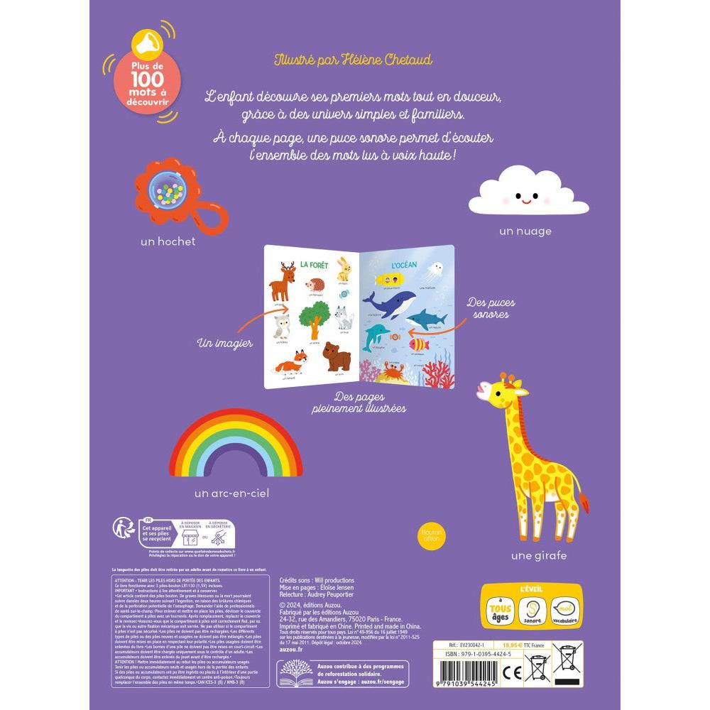 Plus de 100 mots à découvrir avec des puces sonores à chaque page, qui permettent aux petits d’appréhender une nouvelle dimension des objets et mots présentés. Les sons facilitent l’appropriation du nouveau vocabulaire et sa mémorisation. Pointer, nommer, enrichir son vocabulaire et développer son ouïe : un livre d’éveil à manipuler d’abord avec le parent accompagnateur, puis tout seul.