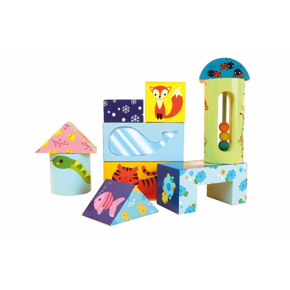 14 cubes en bois dont 6 cubes sensoriels à monter, assembler, empiler... Eléments sensoriels : 4 cubes sonores à agiter, 1 miroir, 1 boulier de 3 billes