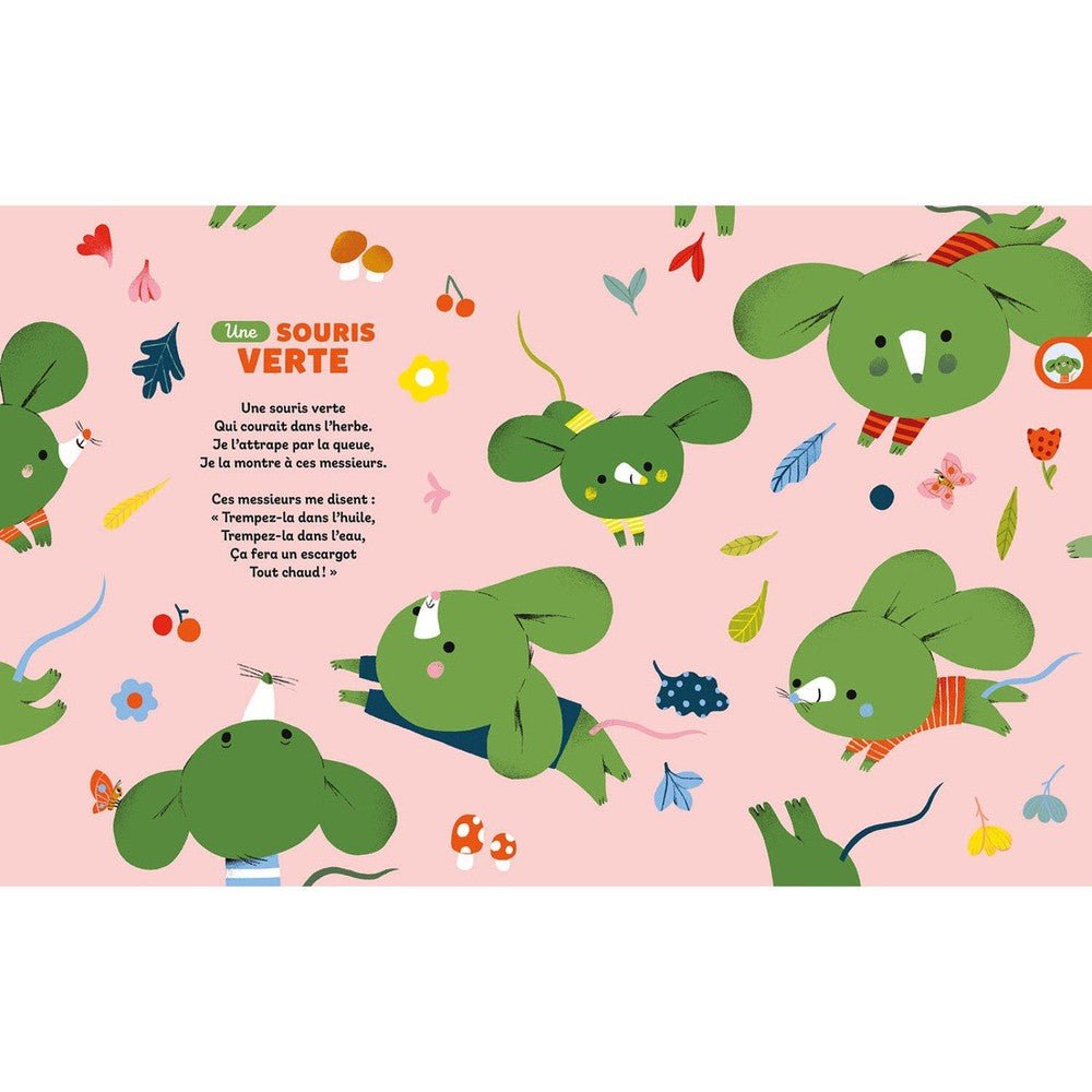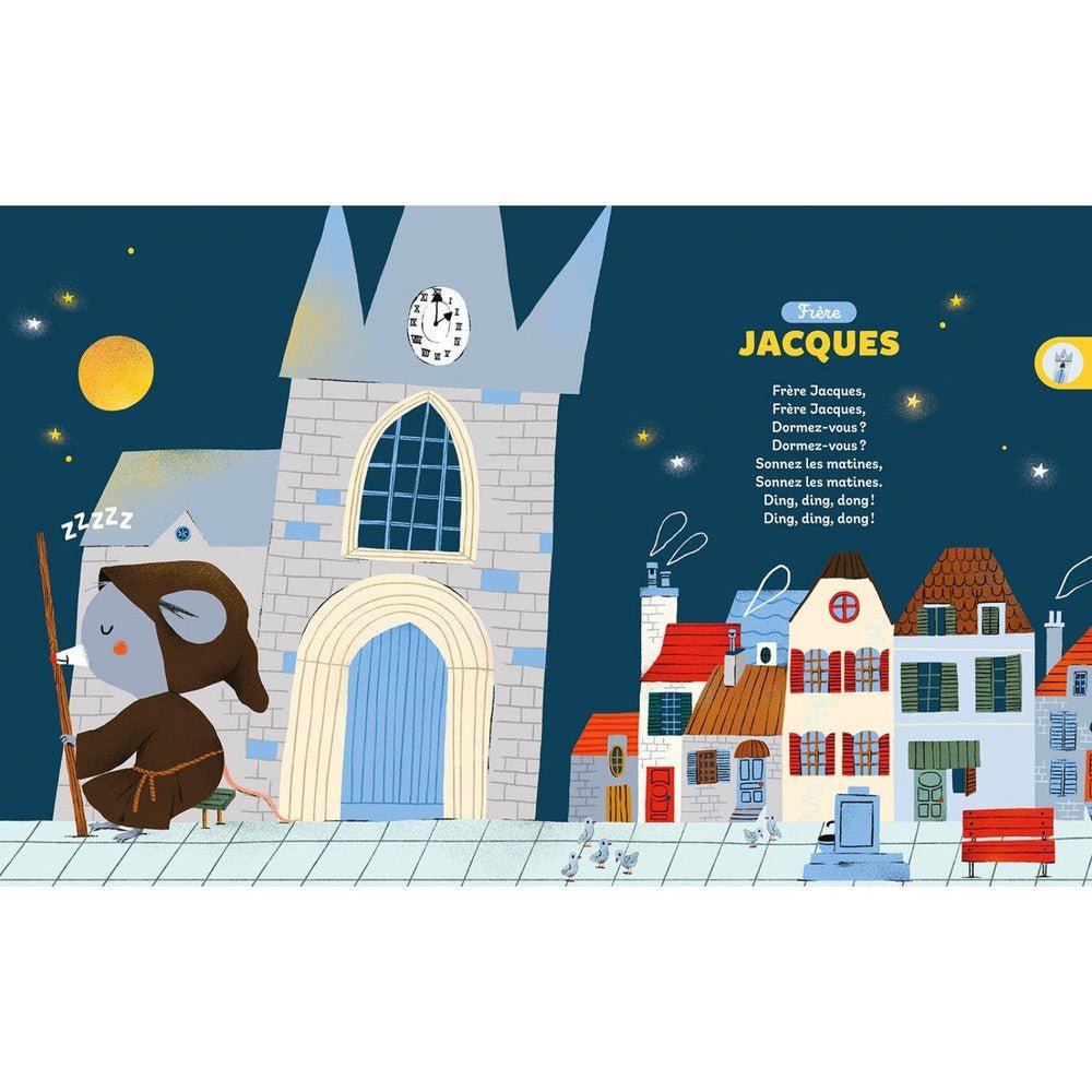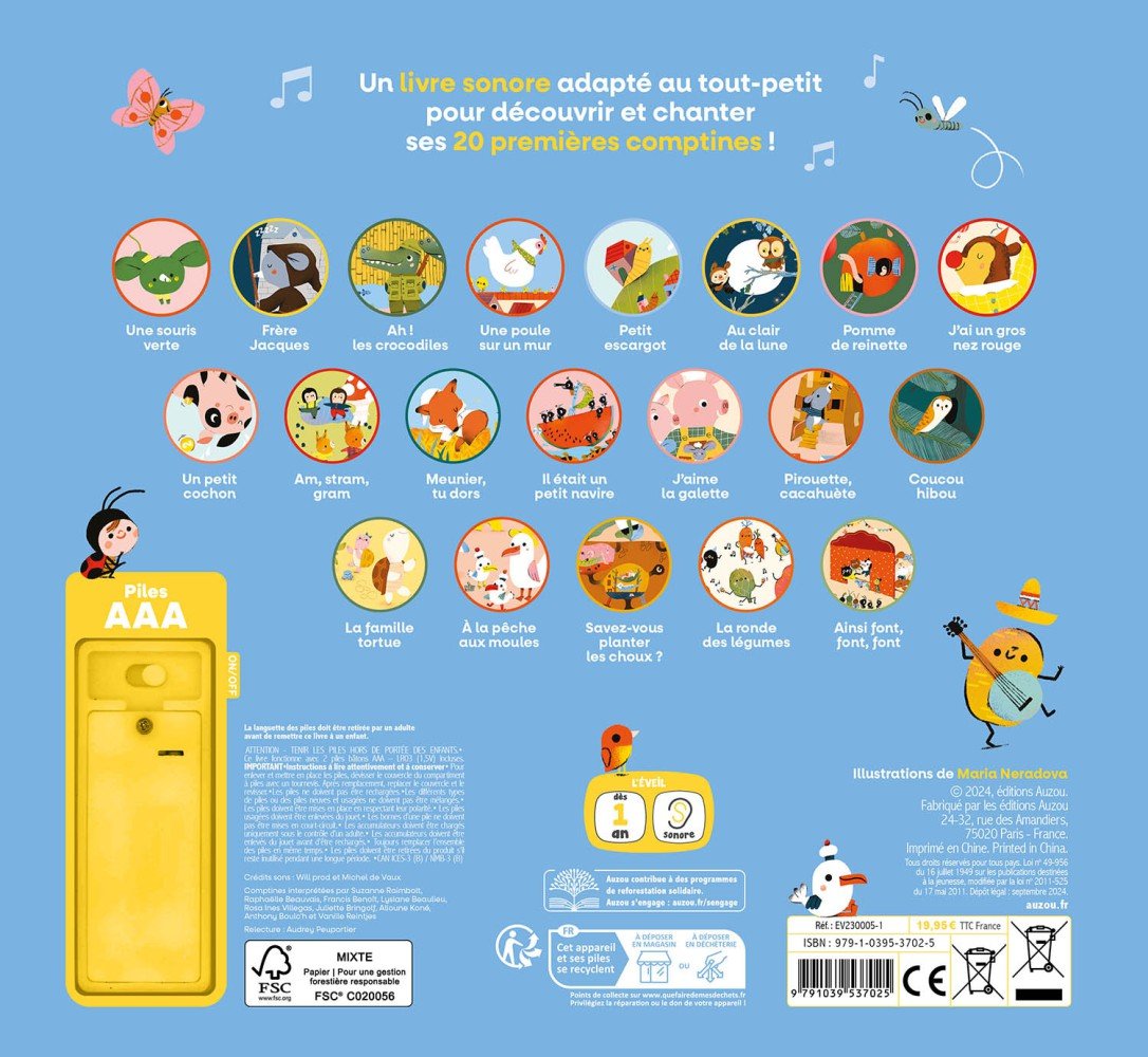Dans ce livre, on retrouve : un livre tout carton avec 20 comptines célèbres illustrées (avec les paroles pour chanter), un module avec 20 puces sonores pour écouter les comptines et un bouton on/off.