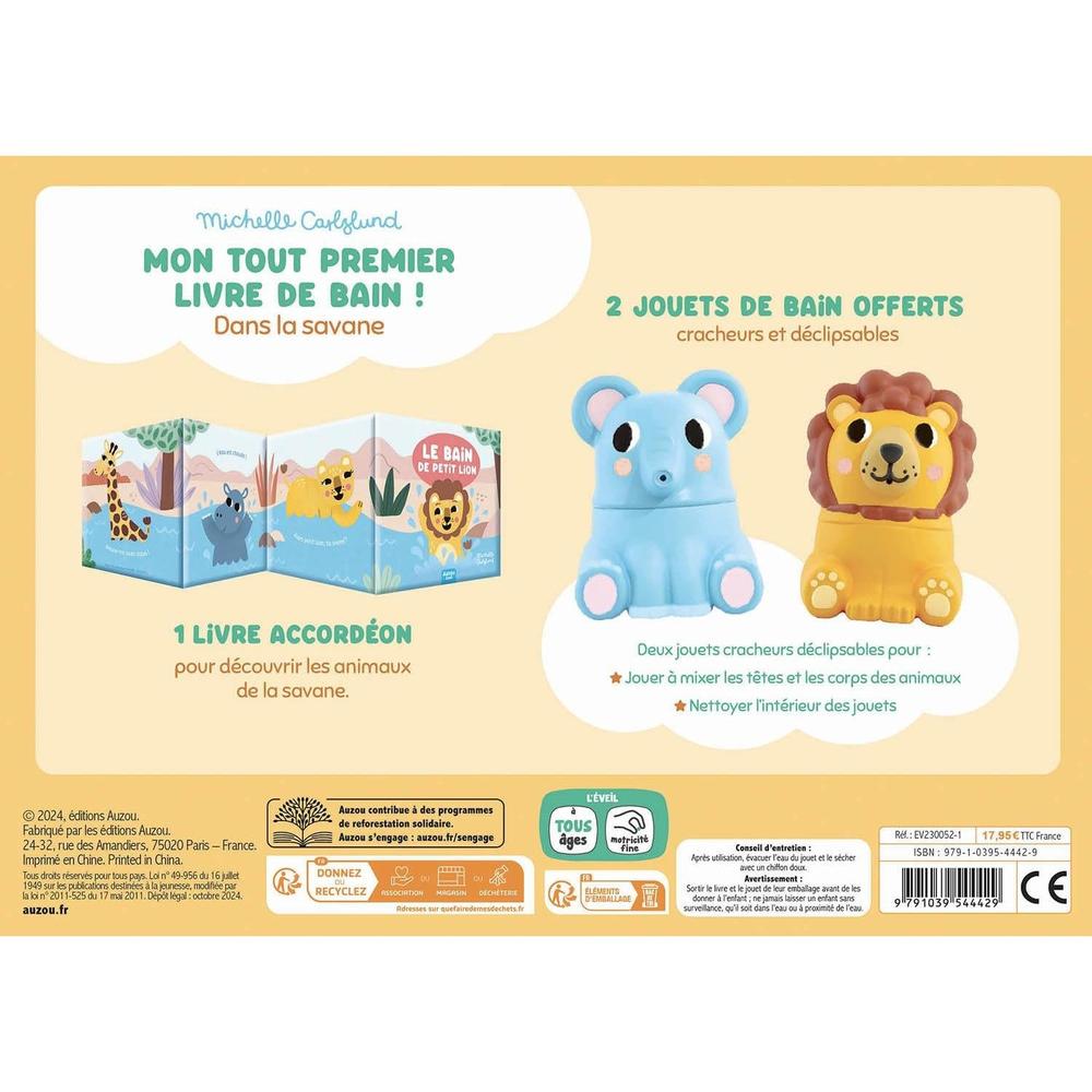 Vivez un super moment complice avec votre enfant pendant le bain ! Ce coffret de bain comporte 1 livre de bain accordéon pour découvrir les animaux de la savane, et 2 jouets de bain cracheurs offerts, en matière recyclée et éco-responsable.