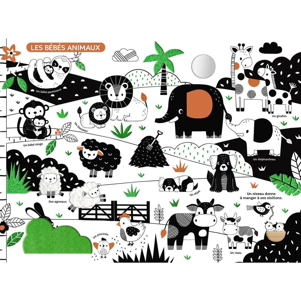 4 grandes planches qui mettent en scène des univers constratés adorés des tout-petits : - La maison et les premiers mots du quotidien- Les bébés animaux- Les animaux géants- Au dodo les animaux !On retrouve plus de 20 matières à toucher et un miroir !