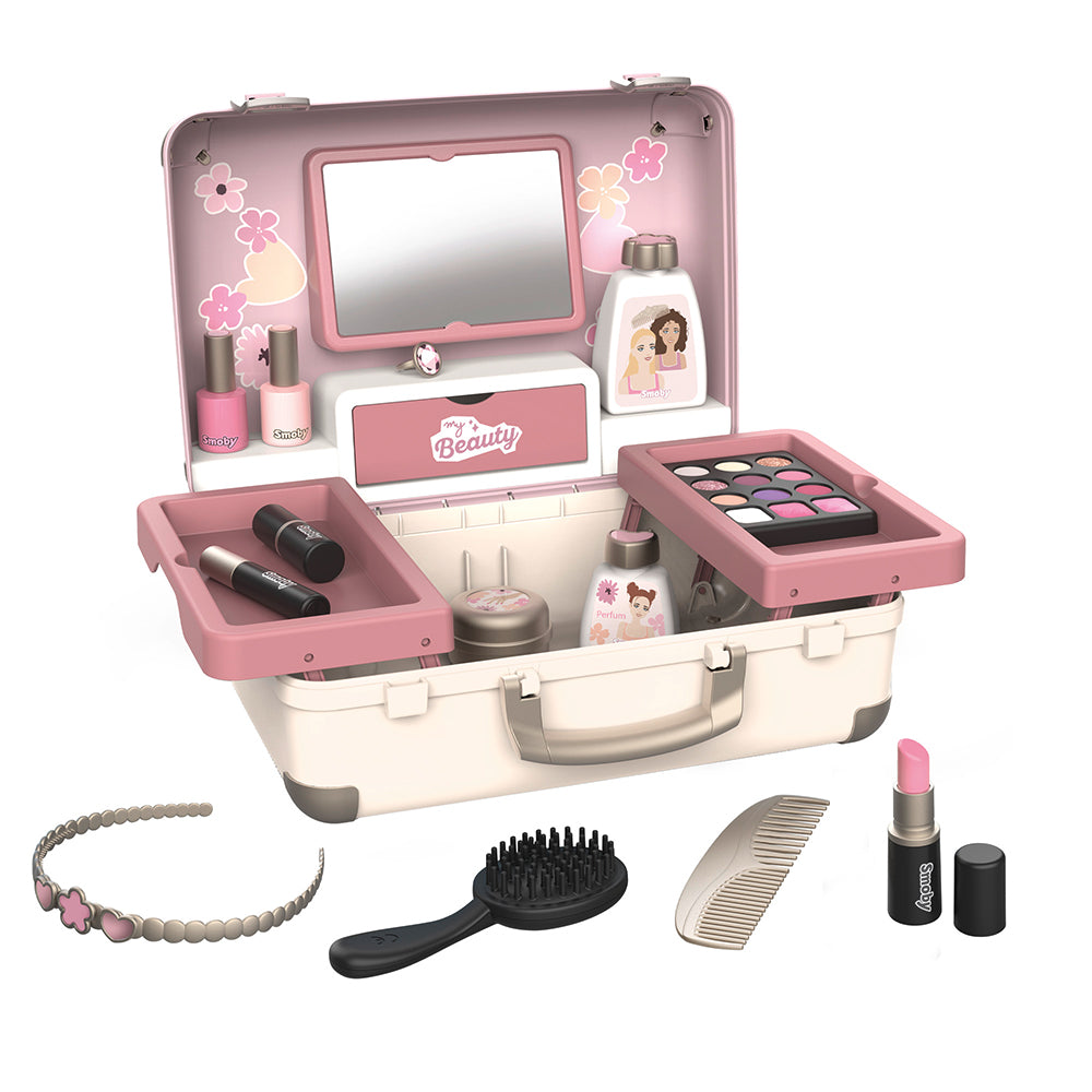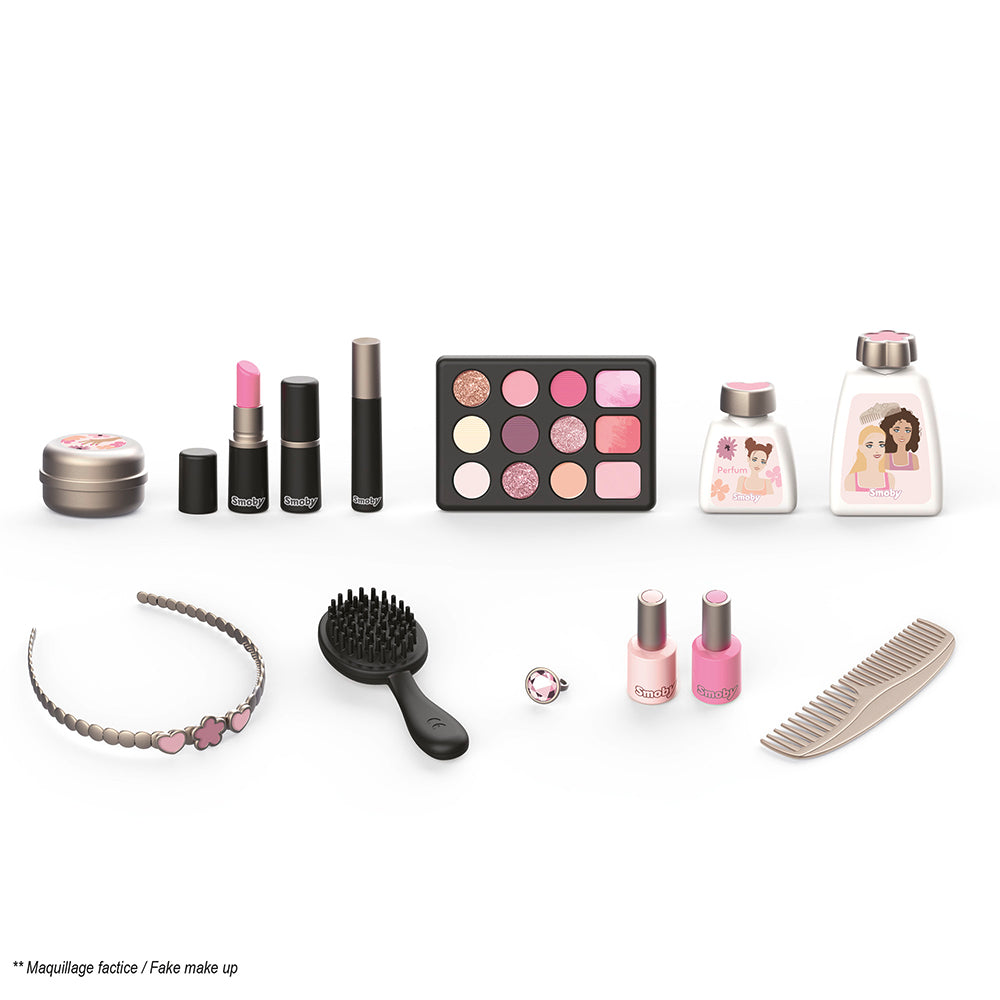 Comprend 13 accessoires : 2 vernis, 2 rouges à lèvres, 1 palette de fards à paupières, 1 mascara, 1 brosse, 1 peigne, 1 serre-tête, 1 bague, et différents flacons.