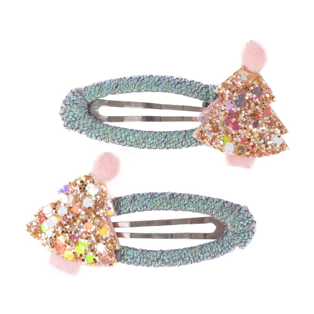 Ces charmantes barrettes arborent une base tressée couleur menthe douce, surmontée d'un sapin de Noël rose et doré scintillant pour une touche de magie festive.