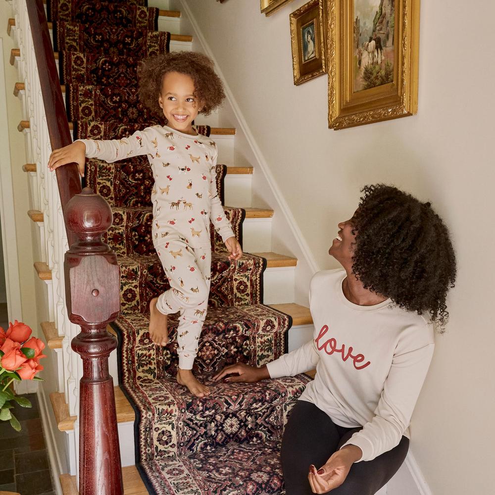 Conçu en côte 1x1 de coton biologique, l’ensemble est léger, doux et respirant – les gardant à la température idéale pendant qu’ils somnolent, se blottissent ou courent après le chien.