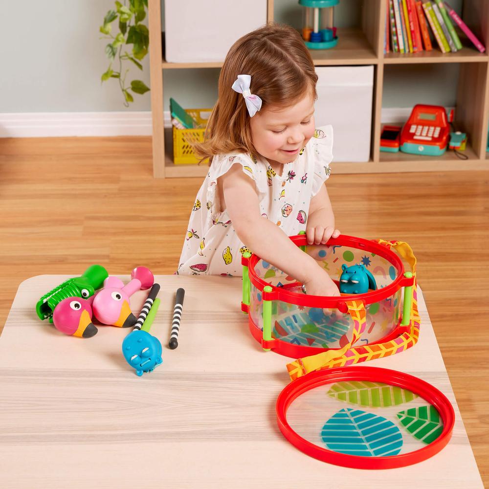 La sangle du tambour sert également de poignée ! Jouer avec des instruments de musique stimule la créativité, améliore le développement cognitif et renforce la confiance en soi. Alors, préparez-vous à taper, secouer, claquer et jouer toute la journée !
